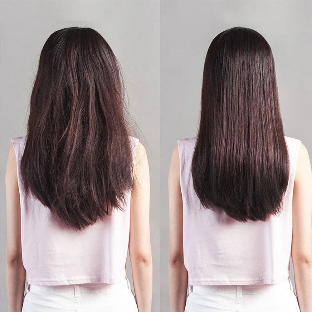 5. Using a 450°F (230°C) flat iron, start at the nape of the neck, taking 1/8 inch sections. Slowly move the ironfrom root to ends 5~7 times (7~10 times for extremely curly coarse hair) infusing the Brazlian Keratin Treatment into the hair shaft. For chemically treated damaged hair reduce heat to 430°(200°C).